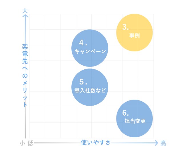 | 3-1. 導入事例(同業他社の動き):同業他社が導入したという「事実」をネタに、課題・契約背景のストーリーを紹介。 | 「〇〇社様(同業)が導入されました。貴社も同様のお悩みをお持ちではありませんか?」 |