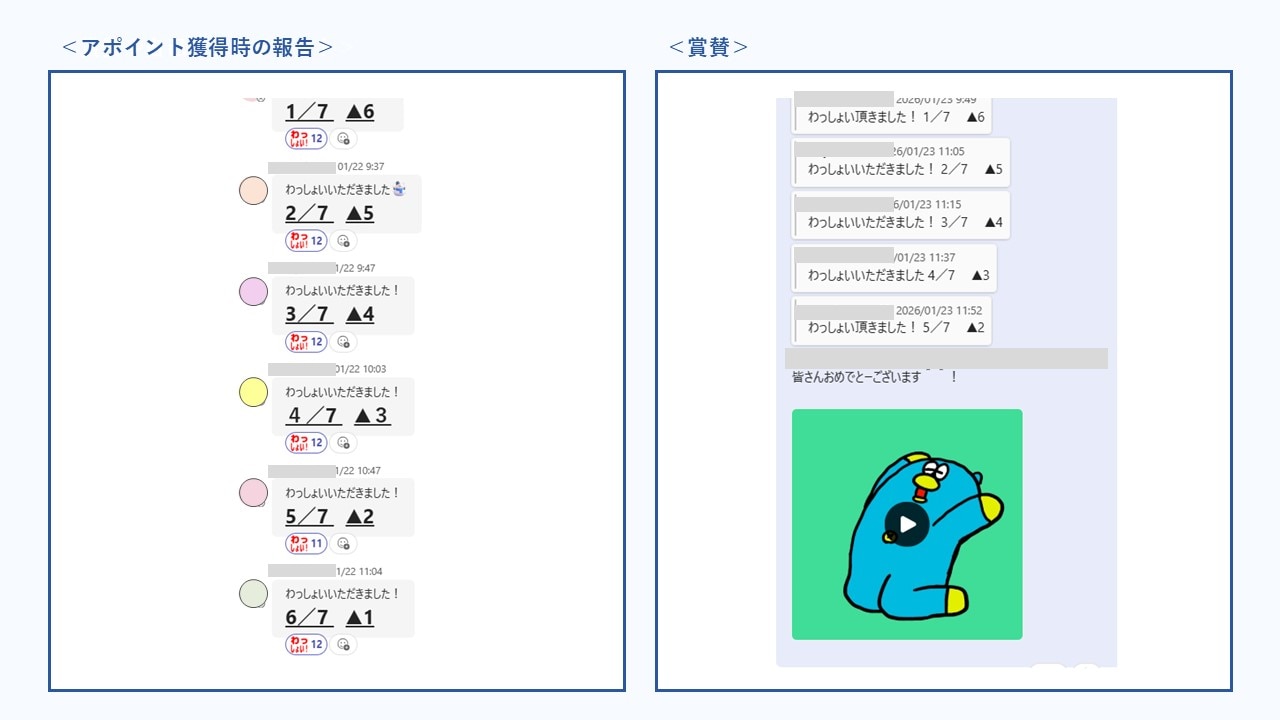 例えば、アポイント獲得を「わっしょい!」と呼び、獲得時にはチャットでお祭りのように称え合う。一見シンプルかつもしかしたらふざけていると思われるかもしれませんが、こうした文化が「もう1件架電してみよう!」「明日も頑張ろう」と思える活力になり、結果としてメンバーのエンゲージメントと生産性を高めてくれます。