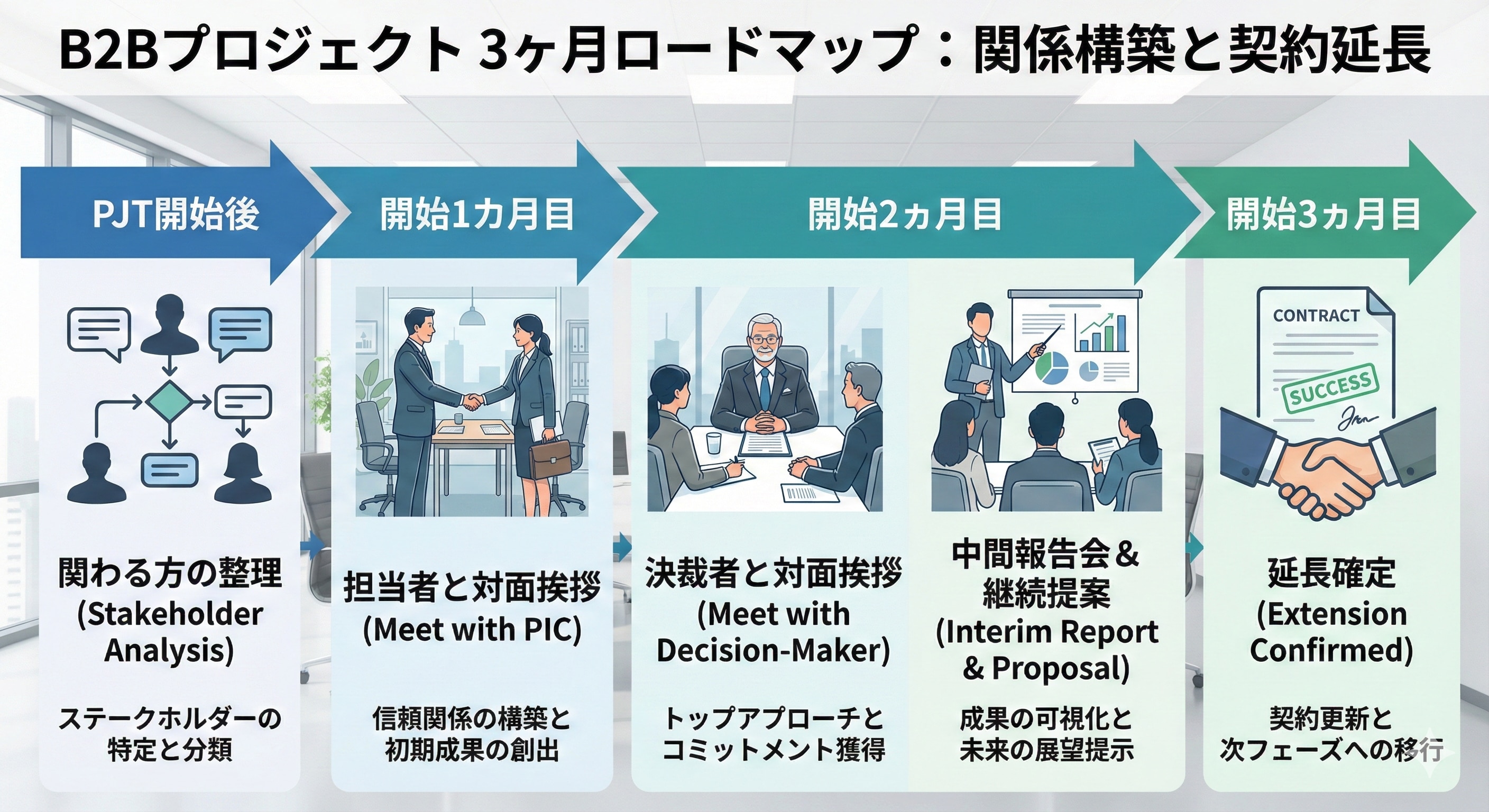 まず前提として、3ヶ月契約の場合、3ヶ月目に継続交渉をしていては手遅れです。大企業であればあるほど、稟議や注文書の発行に軽く見積もっても数週間はかかります。逆算すると、プロジェクト開始から2ヶ月目には決裁者の意向を固めておかなければなりません。