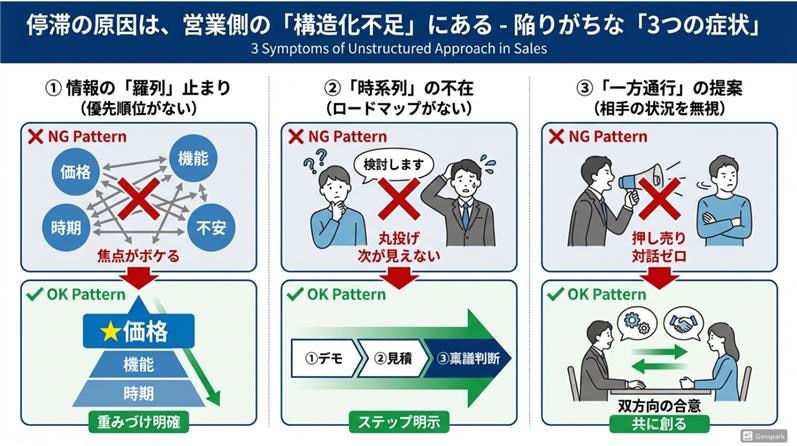ここでは、現場で特に多い「停滞理由」ごとに、どこを構造化し、どう切り返すべきかを整理します。